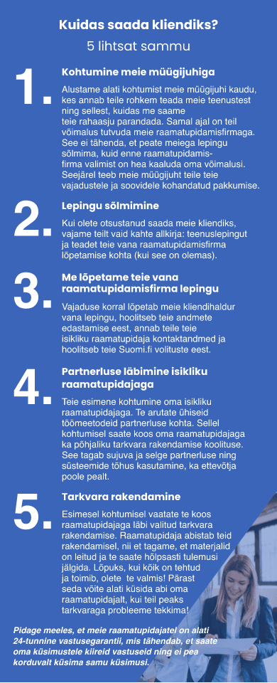 Meie jaoks on kliendid alati partnerid ja me tahame aidata oma klientidel oma äri parandada. Ettevõtte juhtkond ja omanikud on sama kättesaadavad ja kaasatud igapäevatöösse kui meie raamatupidajad. Me teenindame teid isiklikult, isegi suure raamatupidamisfirma eeliseid kasutades.